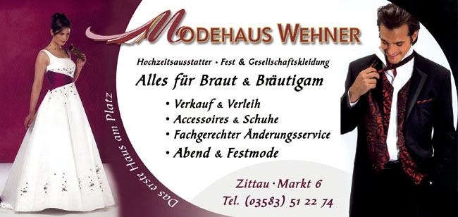 ...das ist Teil der Firmenphilosophie. Seit 1997 richtet das Modehaus Wehner deshalb jährlich die Hochzeitsmesse im Bürgersaal Zittau und zur eigenen Hochzeitshausmesse, wo es Anregungen rund um den schönsten Tag im Leben gibt. Die Modefans aus Zittau und Umgebung sind zudem häufig Gast im Modehaus Wehner bei Modenschauen und ähnlichen Events. Und Mode erleben können auch die Besucher der Bildungs- und Gewerbemesse in Zittau, auf der das Modehaus seit zehn Jahren mit einem Stand vertreten ist.